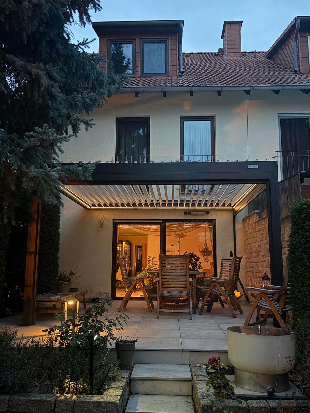 • Beleuchtete Pergolux Pergola am Abend mit Personen, die gemeinsam unter dem Lamellendach sitzen und den Abend genießen.