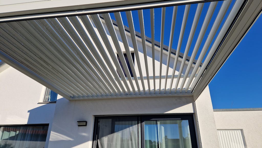 Mühelos anpassbar, einfach zu montieren und wartungsfrei – mit motorisierten Lamellen für optimale Kontrolle bei Sonne, Regen und Schnee.