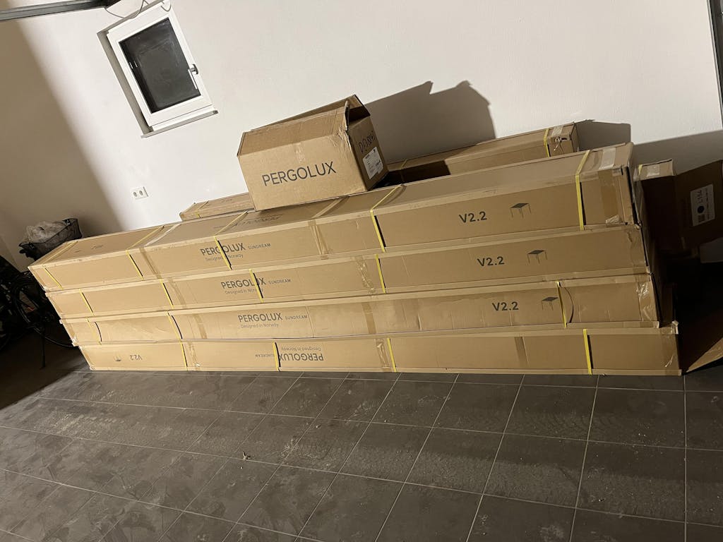 Wenn du die PERGOLUX Pergola vor Aufbau bei dir einlagern möchtest, kannst du alle Packstücke übereinander stapeln, sodass diese nur wenig Platz in Anspruch nehmen.