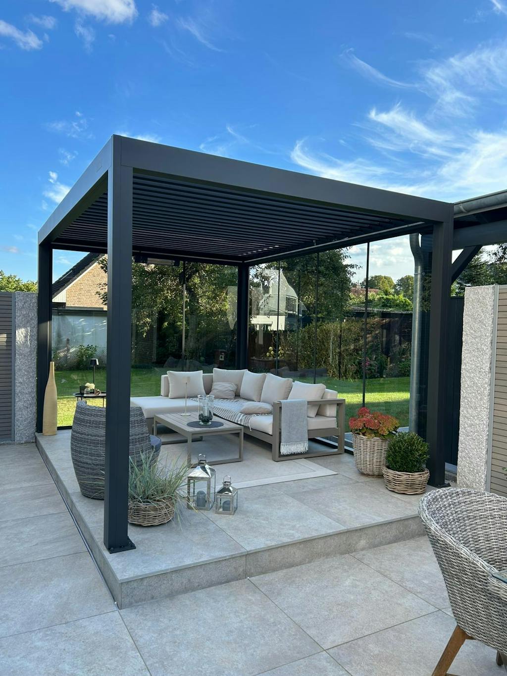 Eine dunkle Pergola sorgt für einen stilvollen Kontrast und hält das Gesamtdesign ausgeglichen.