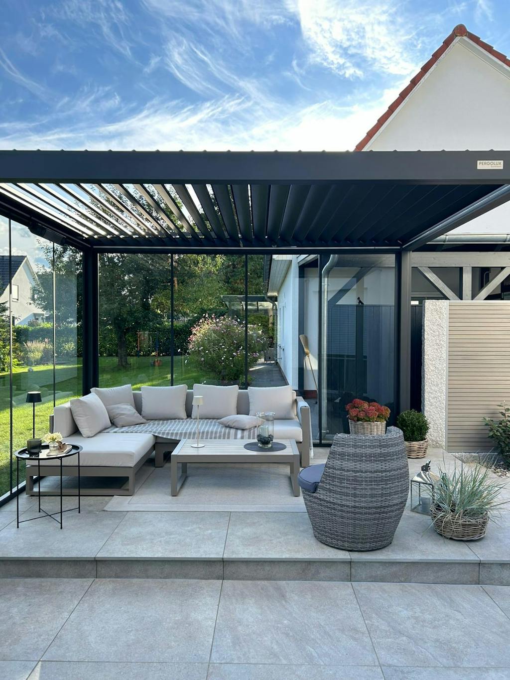 • Pergolux Pergola mit Lounge-Möbeln auf Terrasse im grünen Garten.
